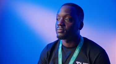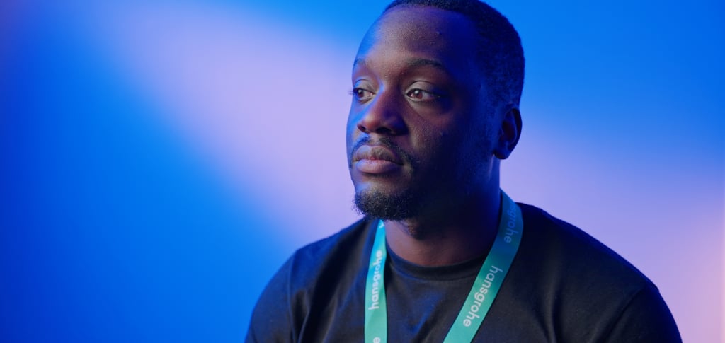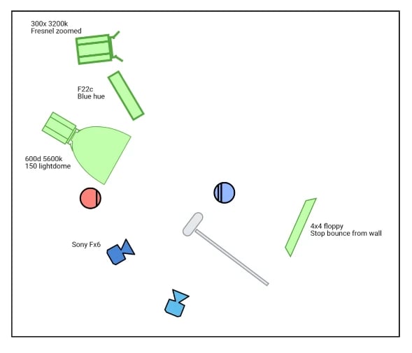 I spoke with the director and asked if the client had any special company colors. She said blue and orange (I know that’s not actually orange, but I’ll get to that). I thought, okay, in that case, forget the white walls. I’ll fill the room with my Amaran F22c and hopefully add a strip of orange to the background using my Aputure 300x. Technically, you could play around with shapes, but I didn’t bring the right equipment for that. You can see in the image that some of the blue spilled onto the left side of his face. I didn’t dislike it, but I did later fix it with some gaffer tape on the side of the Aputure F22c panel to stop the spill and give it a cleaner look.